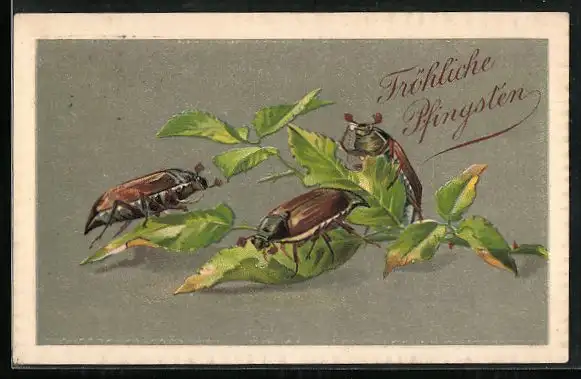 Präge-Lithographie Drei Maikäfer knabbern an Birkenblättern, Pfingstgruss