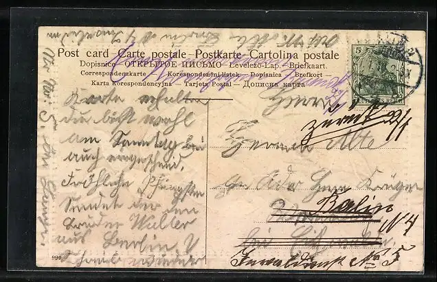 Personenbezogene Daten auf der Rückseite der Karte wurden durch blauen Textmarker unkenntlich gemacht. Die blauen Stellen sind auf die Vorderseite durchgeweicht und wirken sich negativ auf das Postkartenfoto aus