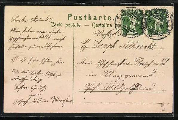Personenbezogene Daten auf der Rückseite der Karte wurden durch blauen Textmarker unkenntlich gemacht. Die blauen Stellen sind auf die Vorderseite durchgeweicht und wirken sich negativ auf das Postkartenfoto aus
