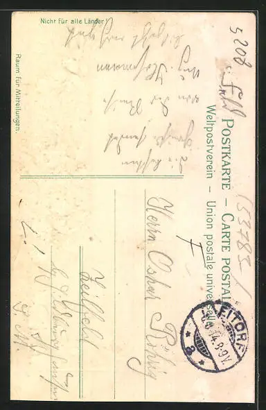 Personenbezogene Daten auf der Rückseite der Karte wurden durch blauen Textmarker unkenntlich gemacht. Die blauen Stellen sind auf die Vorderseite durchgeweicht und wirken sich negativ auf das Postkartenfoto aus