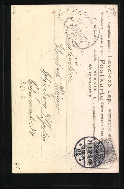 Personenbezogene Daten auf der Rückseite der Karte wurden durch blauen Textmarker unkenntlich gemacht. Die blauen Stellen sind auf die Vorderseite durchgeweicht und wirken sich negativ auf das Postkartenfoto aus