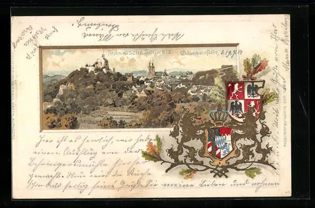 Präge-Lithographie Gössweinstein /Fränkische Schweiz, Teilansicht aus der Vogelschau