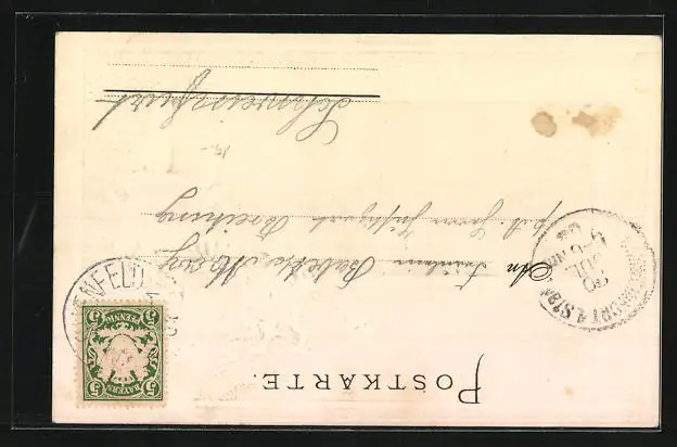 Personenbezogene Daten auf der Rückseite der Karte wurden durch blauen Textmarker unkenntlich gemacht. Die blauen Stellen sind auf die Vorderseite durchgeweicht und wirken sich negativ auf das Postkartenfoto aus