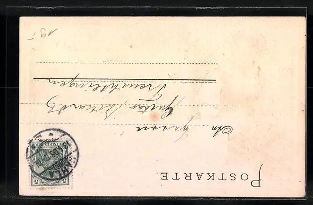 Personenbezogene Daten auf der Rückseite der Karte wurden durch blauen Textmarker unkenntlich gemacht. Die blauen Stellen sind auf die Vorderseite durchgeweicht und wirken sich negativ auf das Postkartenfoto aus