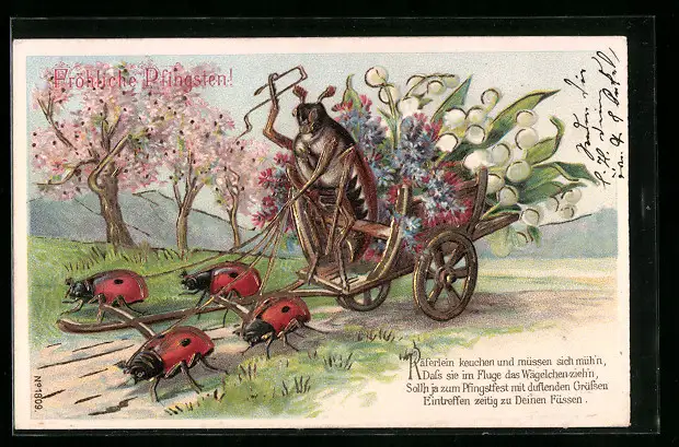 Präge-Lithographie Maikäfer fährt eine Blumenkutsche, von Marienkäfern gezogen, Pfingstgruss