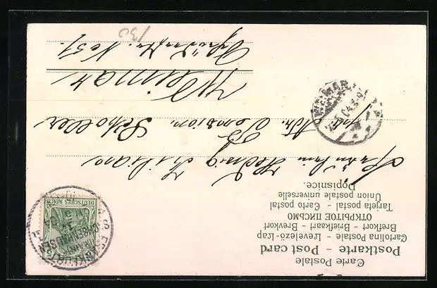 Personenbezogene Daten auf der Rückseite der Karte wurden durch blauen Textmarker unkenntlich gemacht. Die blauen Stellen sind auf die Vorderseite durchgeweicht und wirken sich negativ auf das Postkartenfoto aus