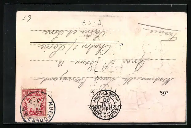 Personenbezogene Daten auf der Rückseite der Karte wurden durch blauen Textmarker unkenntlich gemacht. Die blauen Stellen sind auf die Vorderseite durchgeweicht und wirken sich negativ auf das Postkartenfoto aus