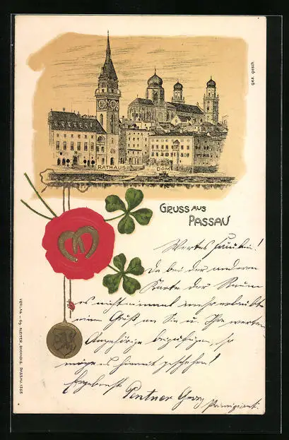 Präge-Lithographie Passau, Rathaus und Kirche