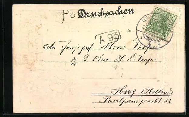Personenbezogene Daten auf der Rückseite der Karte wurden durch blauen Textmarker unkenntlich gemacht. Die blauen Stellen sind auf die Vorderseite durchgeweicht und wirken sich negativ auf das Postkartenfoto aus
