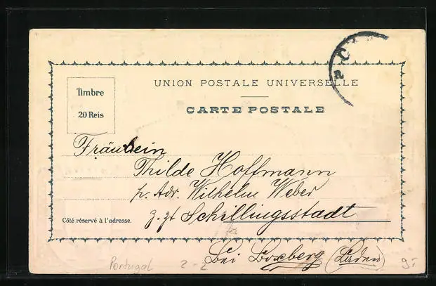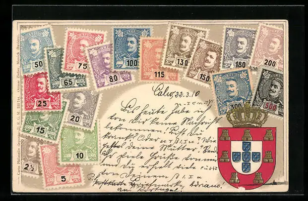 Präge-Lithographie Portugal, Briefmarken und Wappen mit Krone