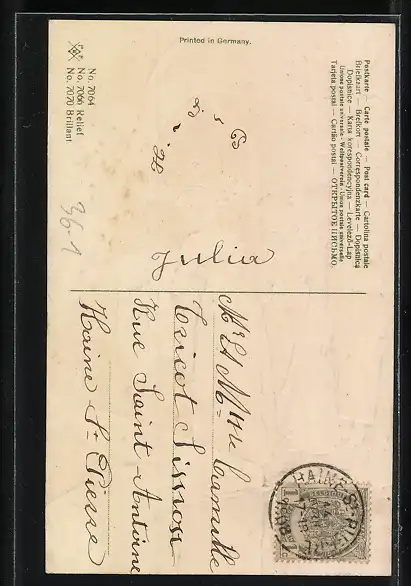 Personenbezogene Daten auf der Rückseite der Karte wurden durch blauen Textmarker unkenntlich gemacht. Die blauen Stellen sind auf die Vorderseite durchgeweicht und wirken sich negativ auf das Postkartenfoto aus