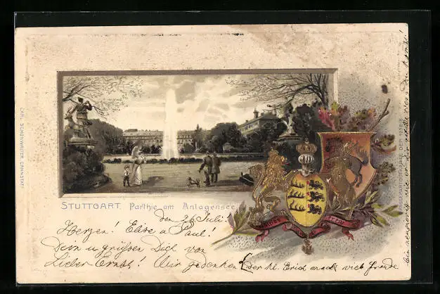 Präge-Lithographie Stuttgart, Partie am Anlagensee, Wappen