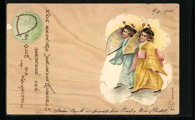 Präge-Lithographie Zwei Geishas mit Fächern beim Spaziergang