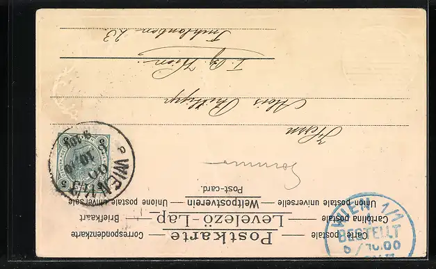 gelaufen 1900, Eckknick u. Abriebspur li. oben, guter Zustand
