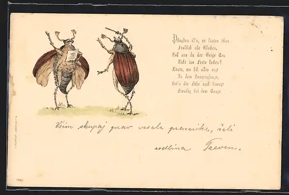 Präge-Lithographie Zwei Maikäfer als Dirigent und Sänger, Taktstock, Notenblatt