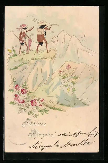 Präge-Lithographie Zwei Maikäfer auf Bergwanderung halten Ausschau, Pfingstgruss
