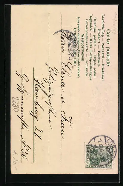Personenbezogene Daten auf der Rückseite der Karte wurden durch blauen Textmarker unkenntlich gemacht. Die blauen Stellen sind auf die Vorderseite durchgeweicht und wirken sich negativ auf das Postkartenfoto aus