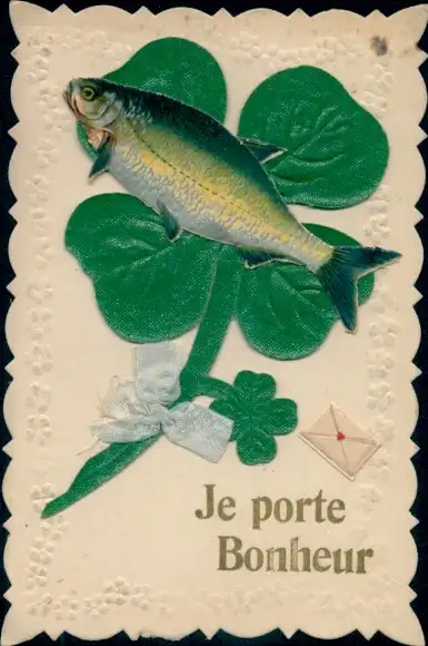 Präge Material Ak Glücksklee, Fisch, Stoffschleife