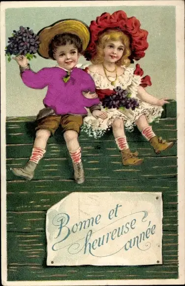 Präge Material Ak Glückwunsch Neujahr, Kinder, Blumenstrauß