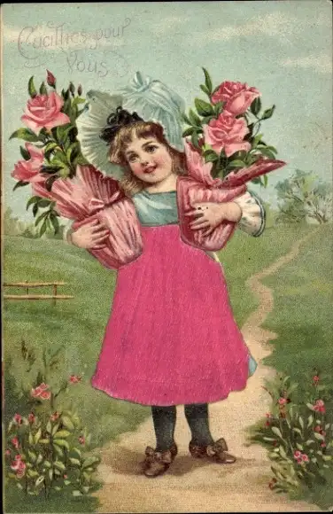 Präge Material Ak Mädchen mit Blumen, Rosen