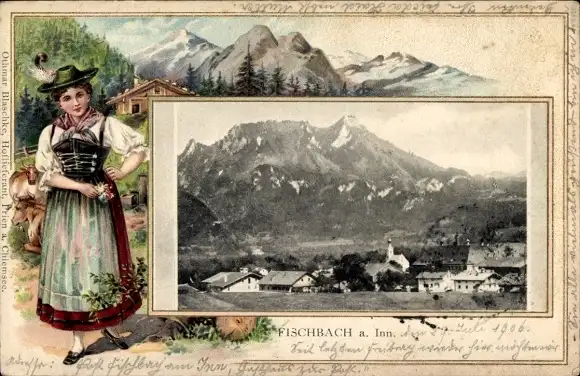 Präge Passepartout Ak Fischbach Flintsbach am Inn Oberbayern, Teilansicht, Frau in Tracht