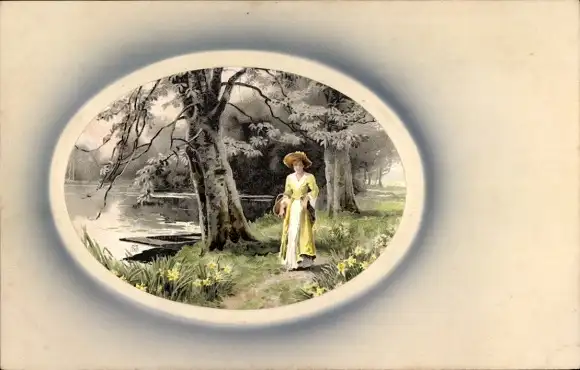 Präge Passepartout Ak Frau auf einer Wiese am Ufer