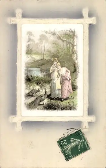 Präge Passepartout Ak Frauen und Pfaue auf einer Wiese