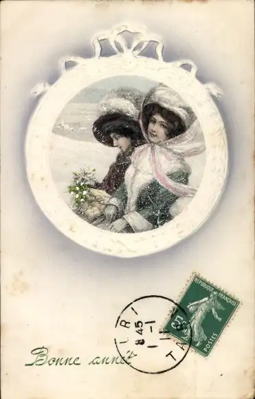 Präge Passepartout Ak Glückwunsch Neujahr, Zwei junge Frauen mit Mistelzweigen