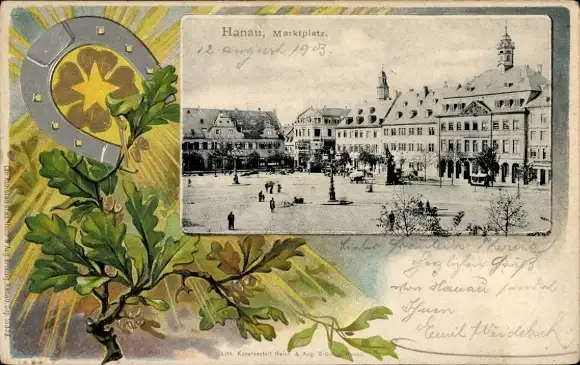 Präge Passepartout Ak Hanau am Main, Marktplatz, Hufeisen, Klee, Stern