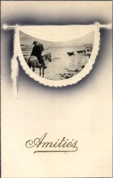 Präge Passepartout Ak Hirte auf einem Pferd, Rinder