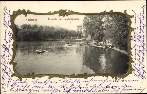 Präge Passepartout Ak Karlsruhe in Baden, Festhalle mit Landungssteg, Kajak