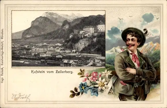 Präge Passepartout Ak Kufstein in Tirol, Gesamtansicht, Zellerberg, Mann in Tracht
