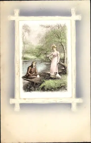 Präge Passepartout Ak Liebespaar, Ruderboot, Fluss, Hund