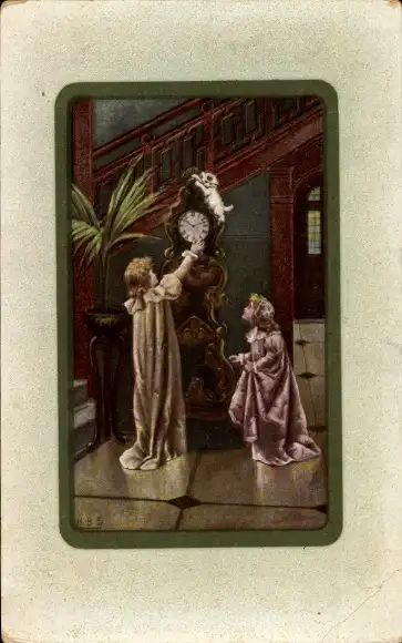 Präge Passepartout Ak Mädchen, Katze auf der Standuhr