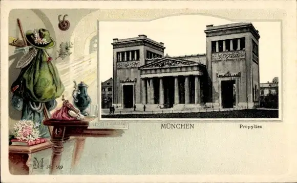Präge Passepartout Ak München, Propyläen, Wanderausrüstung, Rucksack