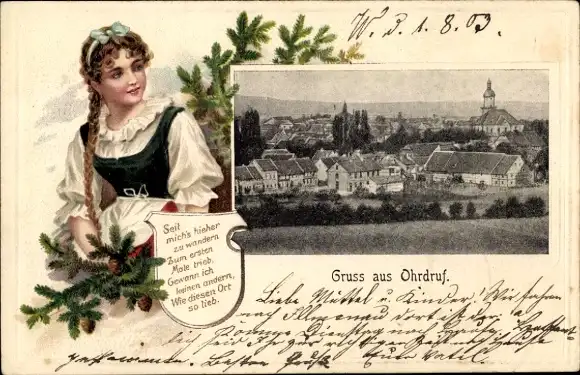Präge Passepartout Ak Ohrdruf in Thüringen, Gesamtansicht, Frau in Tracht