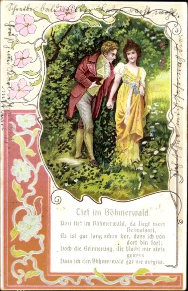 Präge Passepartout Ak Tief im Böhmerwald, Liebespaar, Gedicht, Blumen