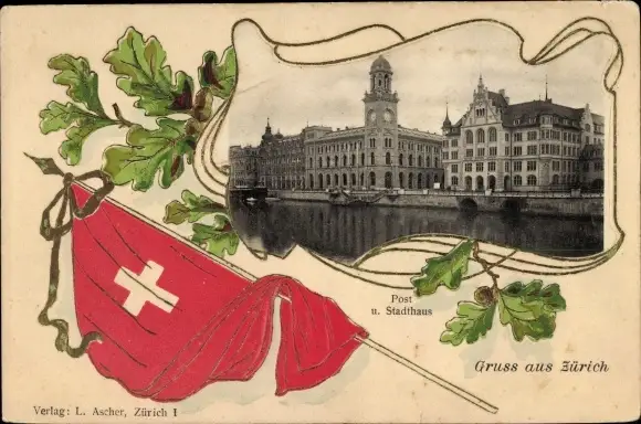 Präge Passepartout Ak Zürich Stadt Schweiz, Post und Stadthaus, Flagge, Eichenlaub