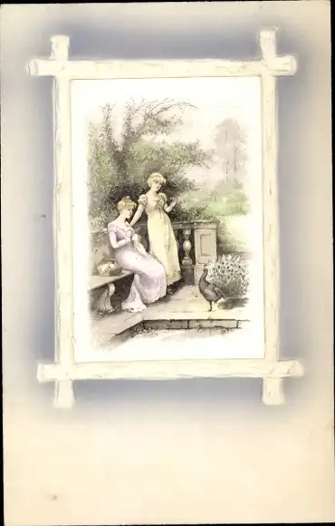 Präge Passepartout Ak Zwei Frauen und ein Pfau