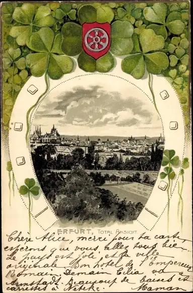 Präge Passepartout Litho Erfurt in Thüringen, Totalansicht, Kleeblätter, Hufeisen