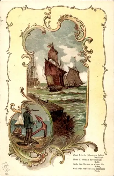 Präge Passepartout Litho Mann mit Fernrohr, Segelboote