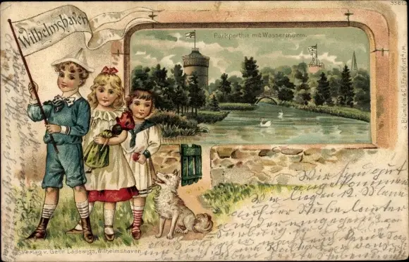 Präge Passepartout Litho Wilhelmshaven, Wasserturm und Parkpartie, Kinder mit Hund, Puppe