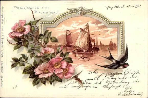 Präge Passepartout Litho mit Blumenduft, Segelboote, Schwalbe