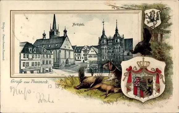 Präge Passepartout Wappen Ak Pößneck in Thüringen, Marktplatz