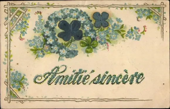Präge Stoff Ak Amitie sincere, Vergissmeinnicht, Glücksklee