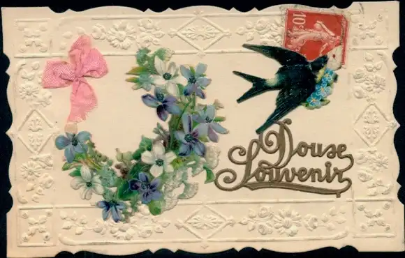 Präge Stoff Ak Blumen, Schwalbe, Kitsch, Stoffschleife