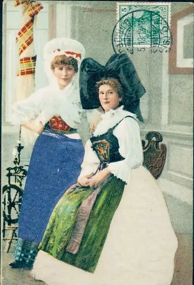 Präge Stoff Ak Frauen in Elsässer Trachten, Spinnrad