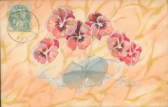 Präge Stoff Ak Glückwunsch 1. April, Fisch, Stiefmütterchen, Stoffschleife
