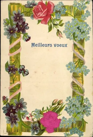 Präge Stoff Ak Kitsch, Blumen, Rosen, Vergissmeinnicht