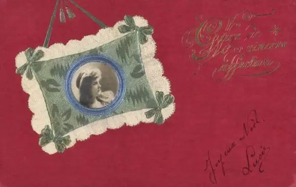 Präge Stoff Ak Portrait einer Frau, Kissen, Schleifen, Kitsch